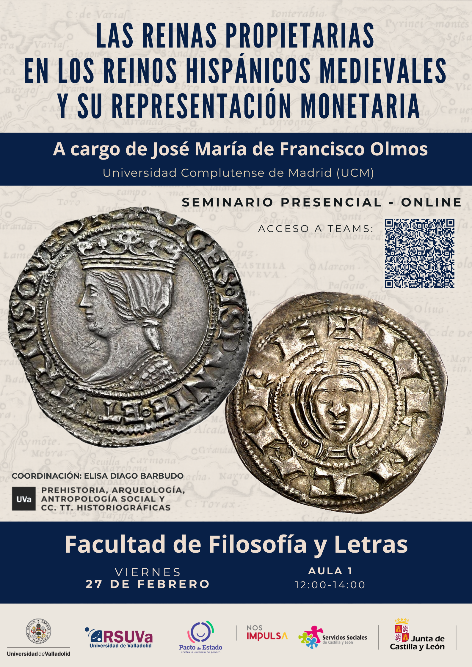 El Área de Ciencias y Técnicas Historiográficas de la Universidad de Valladolid ha organizado el Seminario Las reinas propietarias en los reinos hispánicos medievales y su representación monetaria, coordinado por Elisa Diago.