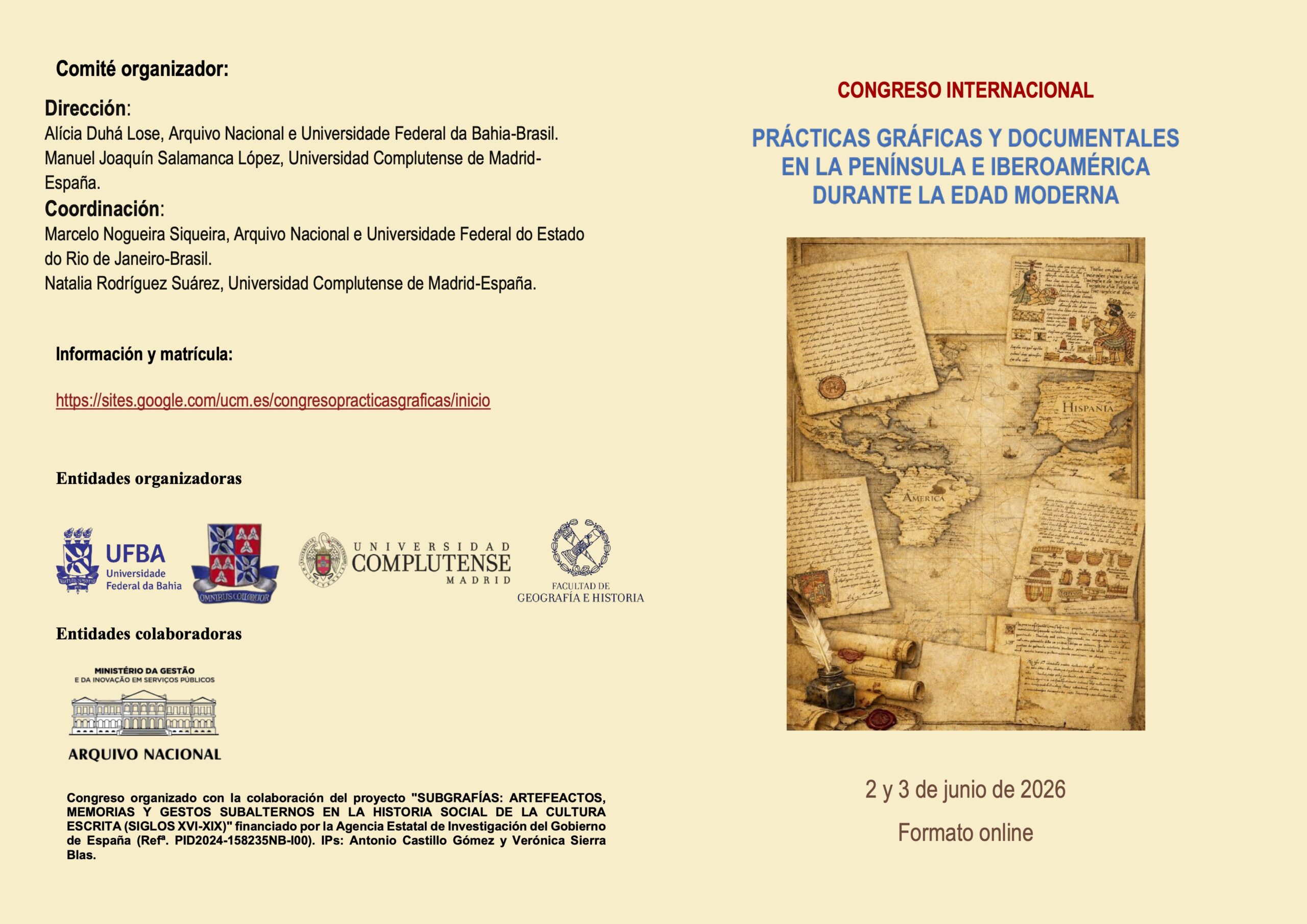 El Congreso Internacional Prácticas gráficas y documentales en la Península e Iberoamérica durante la Edad Moderna tendrá lugar, de manera virtual, los días 2 y 3 de junio de 2026. Estará bajo la dirección nuestro compañero Manuel Salamanca López, Universidad Complutense de Madrid, y de Alícia Duhá Lose, Universidade Federal da Bahia.